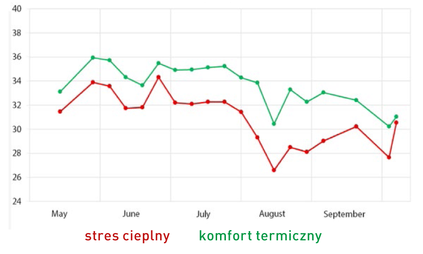 Neutralność termiczna dla krowy wynosi od 0 do 20C; optymalna temperatura dla jej komfortu wynosi od 5 do 15C. Powyżej 20C krowa cierpi z powodu stresu termicz- nego, co przekłada się na: