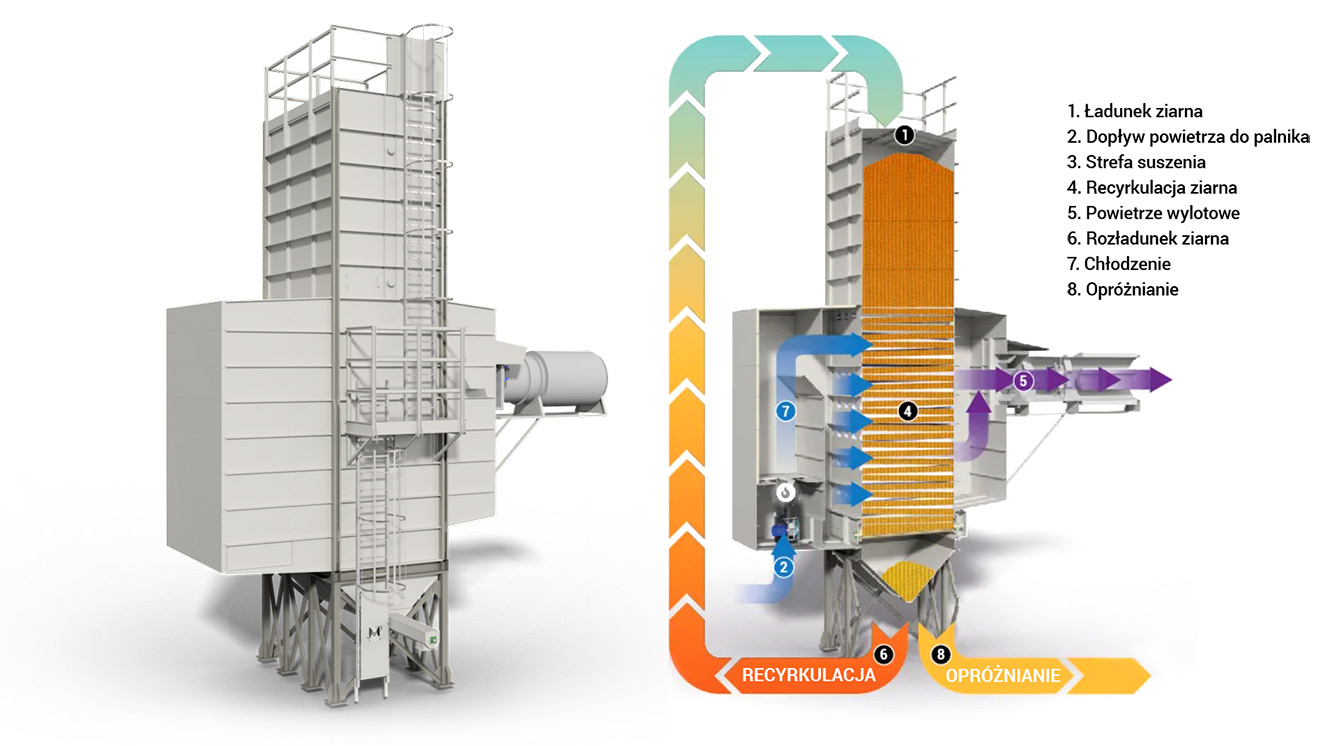 Ziarno jest podawane do górnej części kolumny suszącej, aż do całkowitego wypełnienia sekcji rezerwowej (1). Następnie zaczyna stopniowo opadać w dół, podczas gdy zoptymalizowany przepływ powietrza nieprzerwanie i równomiernie usuwa wilgoć (3). Strumień powietrza został zaprojektowany tak, aby zapewniać jednolite suszenie oraz odprowadzać najbardziej wilgotne powietrze, które przeszło przez górną część kolumny.
